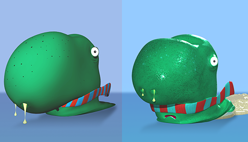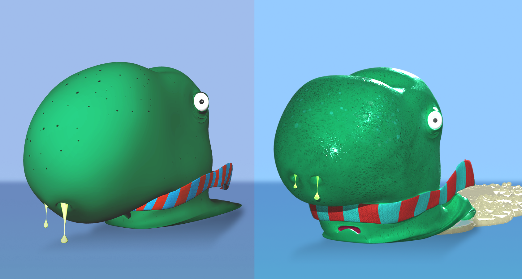 Neben dem äußerlichen Upgrade habe ich in meinem 5. Semester außerdem das Riggen, sowie das Animieren der Figur in Angriff genommen und so Mr. Bogey nach so langer Zeit endlich zum Leben erweckt. Vor allem auf die Partikelanimation der Schleimspur bin ich besonders stolz, da dies mein erster Kontakt mit dem nParticle Tool aus Maya war.