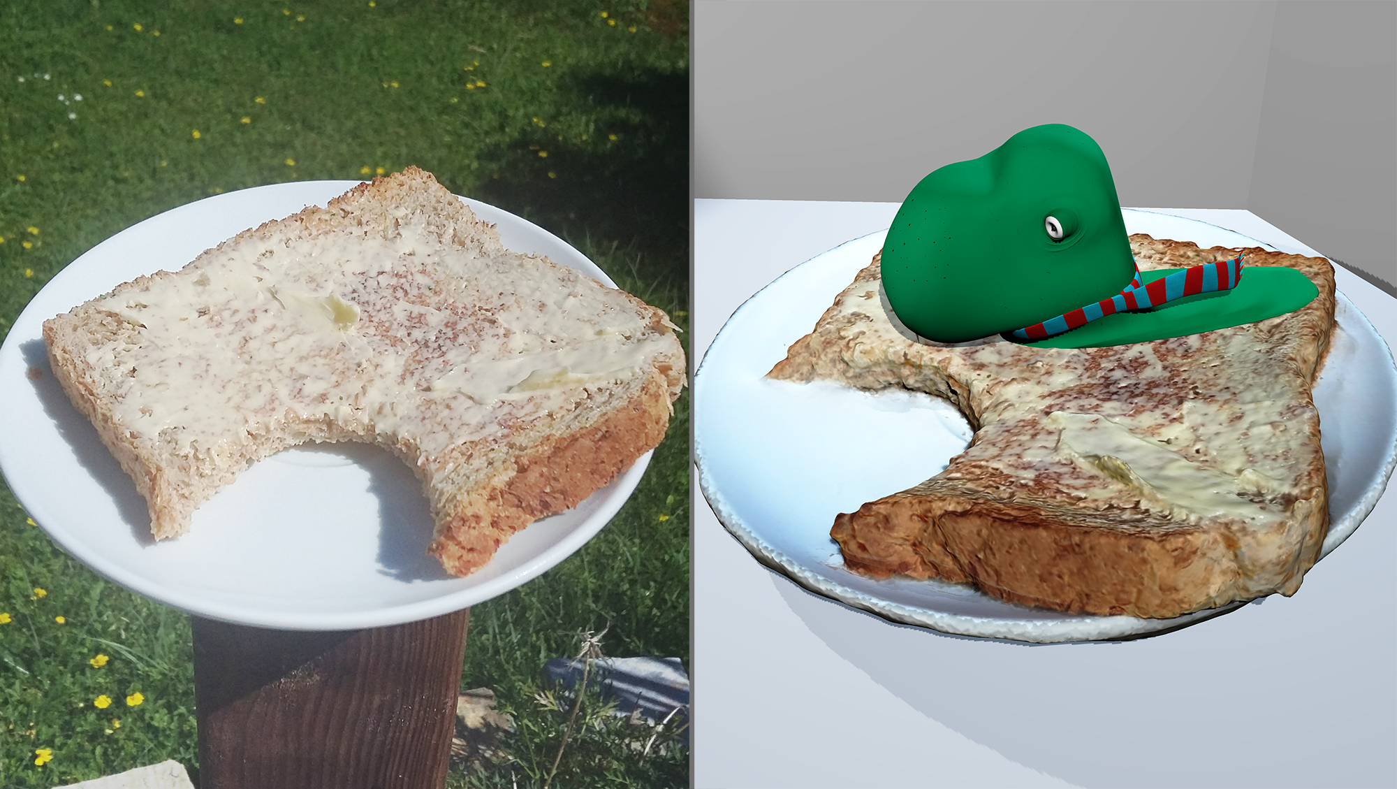 Im selben Kurs haben wir damals außerdem das Thema 3D Scanning kennengelernt und dies mit dem Tool Recap von Autodesk auch gleich praktisch angewandt. Meine fertigen 3D Figur habe ich für die damalige Projektarbeit dann auf einer eingescannten Toastscheibe platziert, was auch die Idee für einen späteren Kurzfilm ebnete.