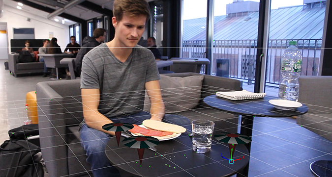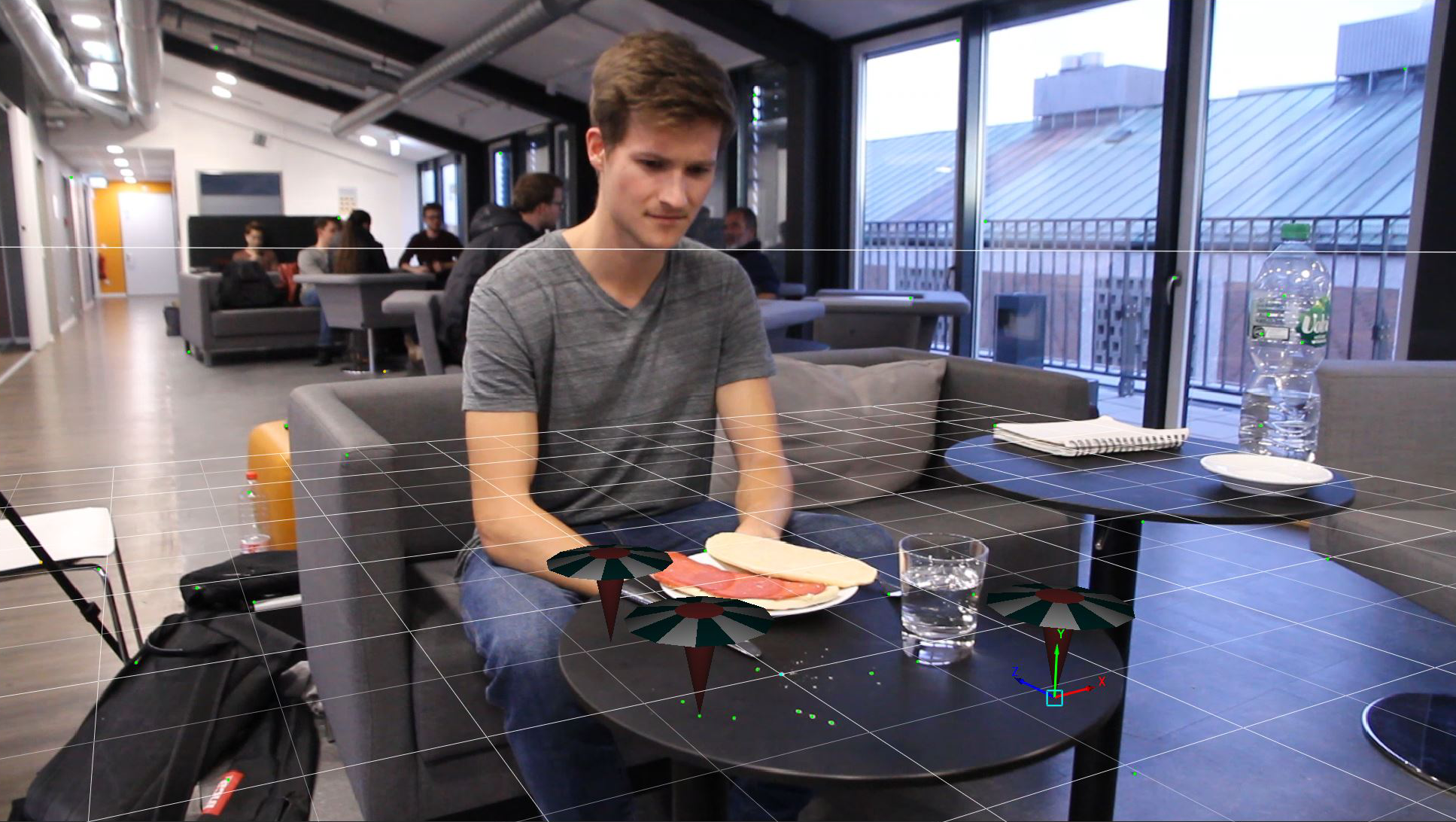 Für den Kurs Spezielle Themen der Animation hatten wir im fünften Semester die Aufgabe einen Kurzfilm zu erstellen, welcher in mindestens einem Shot einen 3D Track enthält. Unter einer getrackten Videoaufnahme versteht man für Gewöhnlich eine, deren Kameraposition und -bewegung so akkurat wie möglich digital erfasst worden ist, um CGI Elemente passend zur Kamerabewegung hinzufügen zu können. Wir haben mit der Software PFTrack gearbeitet und ich drehte hierfür eine kleine Szene in der Cafeteria meiner Uni, in welche ich später Mr. Bogey implementierte. Die Kamerabewegung konnte ich dabei mit Hilfe der dort extra platzierten Brotkrümeln auf dem schwarzen Cafeteriatisch ermitteln.