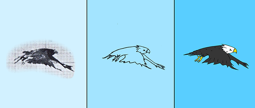 Although the quality of the photos was not the best, compared to today's digital cameras, it was quite sufficient to capture the different shapes of the wings and the correct position of the bird. I decided to take nine different screenshots from the video to get a smooth and shapely animation, to then reproduce the eagle's postures as accurately as possible in Adobe Photoshop.